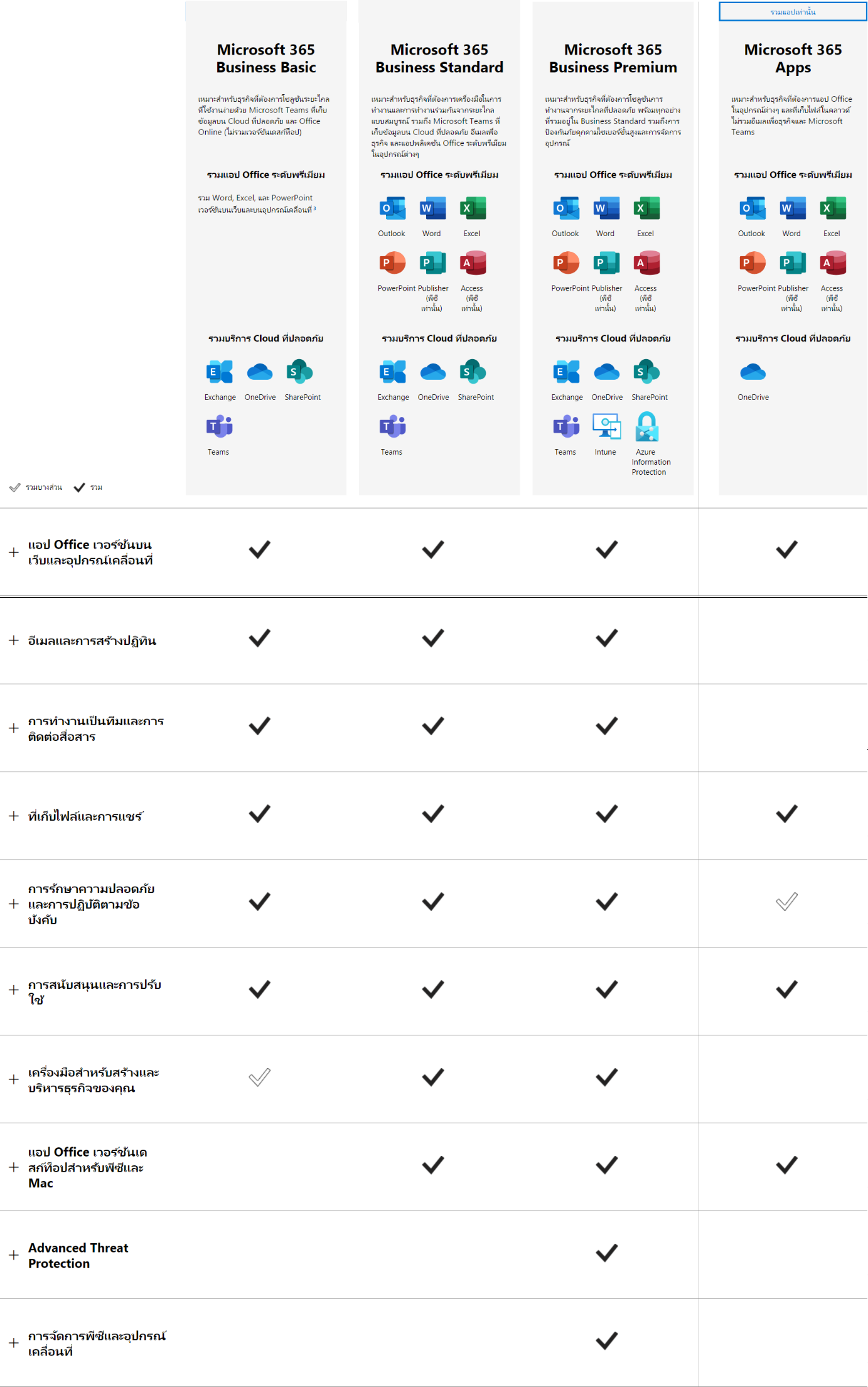 ตารางเปรียบเทียบ ชุดโปรแกรมจัดการสํานักงาน ที่มีลิขสิทธิ์ถูกต้องตามกฎหมาย Microsoft 365 ในแต่ละเวอร์ชัน
