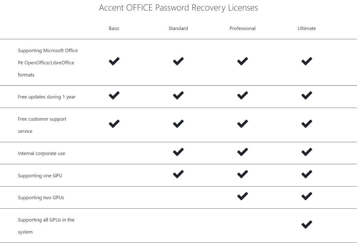 สำหรับโปรแกรมปลดล็อกรหัสผ่าน Accent OFFICE Password Recovery นั้นมีวางจำหน่ายในท้องตลาดอยู่ทั้งหมด 4 เวอร์ชันหลักๆ ด้วยกันคือ