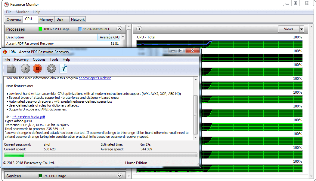 ทั้งนี้การันตีเรื่องความเร็วในการปลดล็อกรหัสผ่านของไฟล์เอกสาร PDF ที่มีความแน่นหนา โดยรองรับทั้งการปลดล็อกรหัสผ่านเพื่อการ เปิดดู (Open Password) และปลดล็อกรหัสผ่านเพื่อการ กำหนดสิทธิ์ (Permissions Password)