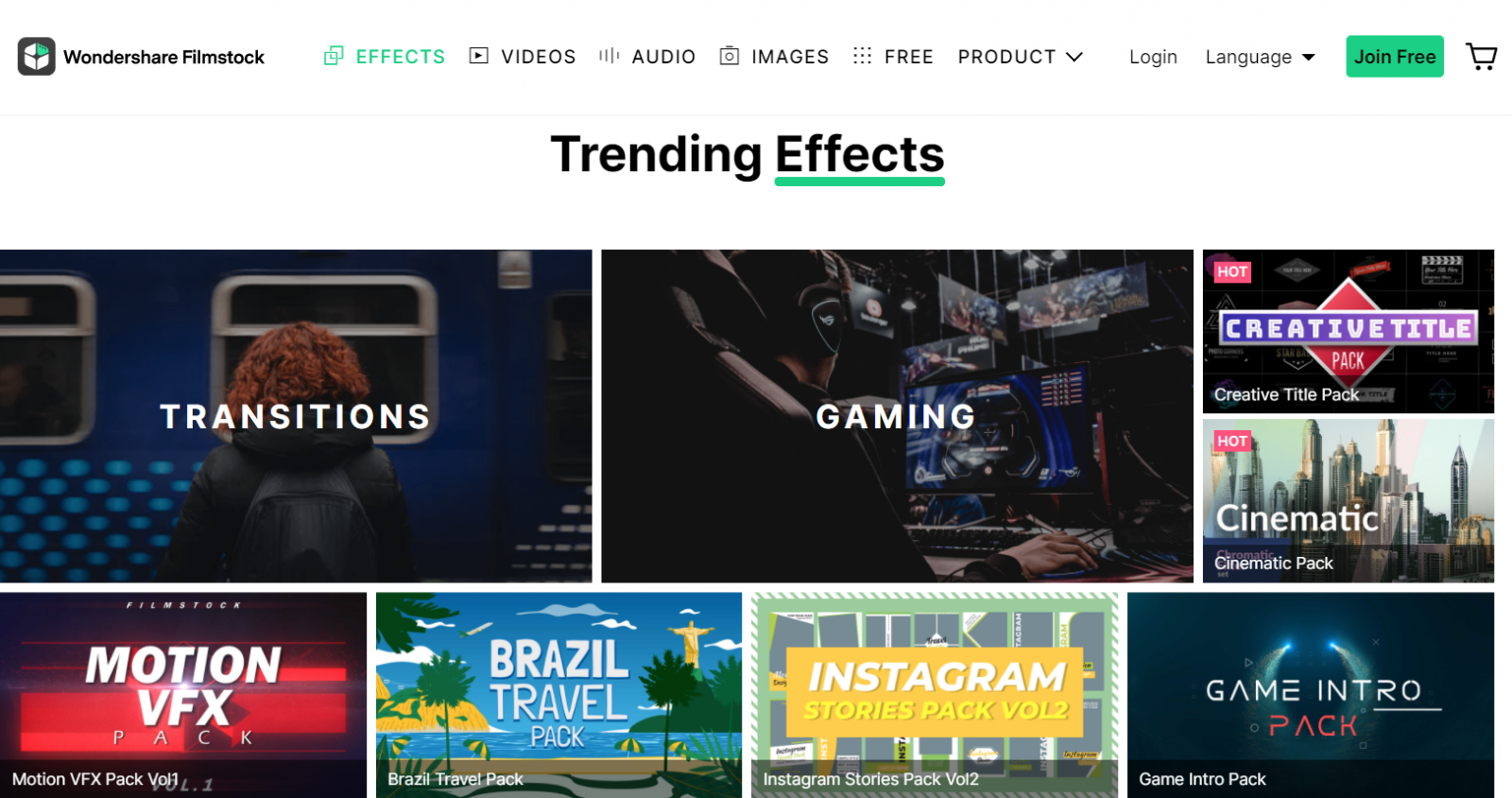 โปรแกรมรวมสต็อกวิดีโอ ภาพนิ่ง ดนตรีประกอบ ลูกเล่น Wondershare Filmstock มาพร้อมวิดีโอเอฟเฟคหลากหลายแนว ที่ช่วยแต่งเติมความสนุกสนาน แปลกใหม่น่าตื่นตา ให้กับผลงานวิดีโอของเราได้เป็นอย่างดี โดยมีการคัดสรรวิดีโอเอฟเฟคมากมายหลายแนว ให้มืออาชีพด้านงานวิดีโอได้หยิบไปใช้ อาทิ Transitions แบบสวยๆ มีชีวิตชีวา , เอฟเฟคสำหรับวิดีโอเกมแคสเตอร์ หรือการแข่งขันเกม (Gaming) , เอฟเฟคงานโมชันกราฟิกเท่ๆ (Motion VFX) และเอฟเฟคฟิลเตอร์ ที่ช่วยปรับแต่งภาพวิดีโอให้ดูดีเหมือนภาพยนตร์ (Cinematic)