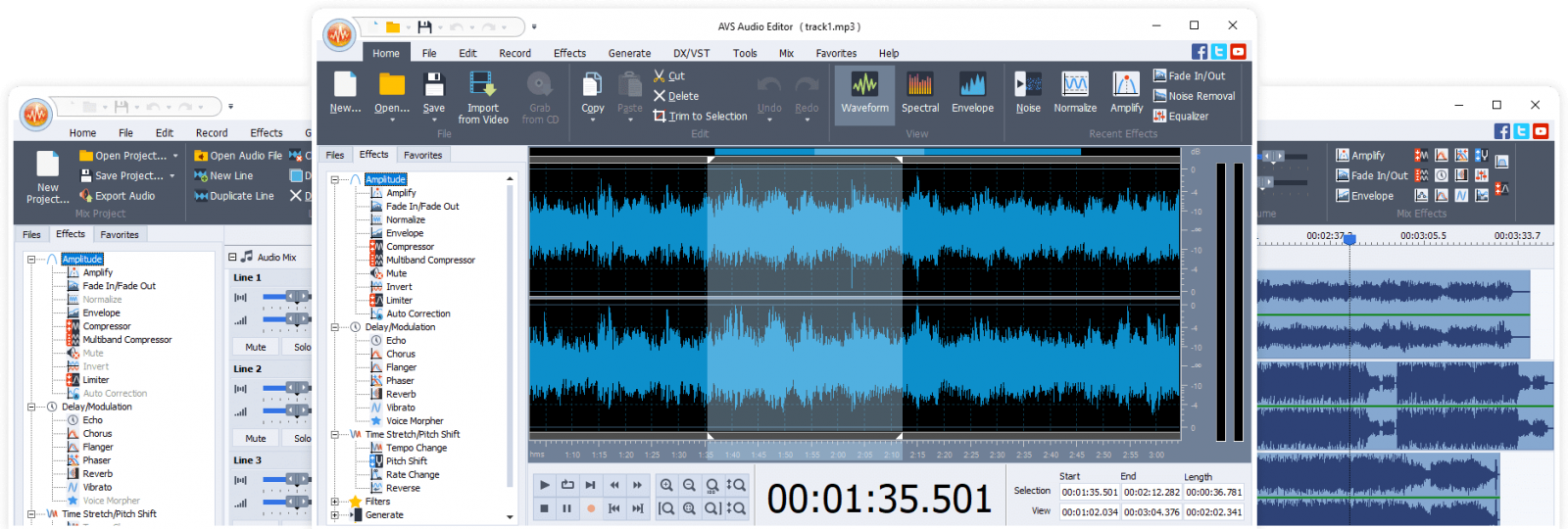 โปรแกรม AVS Audio Editor โปรแกรตัดต่อเสียง ที่เหมาะสำหรับงานสร้างเสียงริงโทน และงานเตรียมแทร็ก (Track) เสียงสำหรับนำไปประกอบภาพวิดีโอ หรือการจัดทำ รายการ Podcast เป็นต้น ทำงานกับไฟล์เสียงได้หลากหลายฟอร์แมต รองรับไฟล์เสียงได้หลายแทร็ก มีเอฟเฟคเสียง สามารถบันทึกเสียง และแก้ไขปัญหาเสียงรบกวนที่เกิดจากบันทึกเสียงได้ด้วย