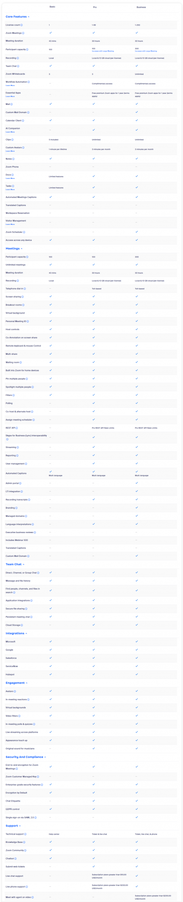 โปรแกรมประชุมออนไลน์ รุ่นโปร เหมาะสำหรับองค์กรขนาดเล็ก รองรับการประชุมได้สูงสุด 100 คนต่อครั้ง จำนวนผู้บริหาร/หัวหน้างานที่สามารถ Host ประชุมได้ 1 คน (1 ลิขสิทธิ์ต่อ 1 Host) รองรับกระดาน Whiteboard สำหรับแชร์ไอเดีย จำนวน 3 กระดาน มาพร้อมกับบริการ Mail and Calendar เข้าถึงอีเมลและปฏิทินที่ใช้ในการทำงานผ่านโปรแกรม Zoom (รองรับ Gmail และ Microsoft 365) และมาพร้อมระบบ AI Companion ระบบปัญญาประดิษฐ์ AI สรุปเนื้อหาการประชุม เนื้อหาแชท และมีพื้นที่บนคลาวด์ 10 GB. เก็บบันทึกวิดีโอการประชุม