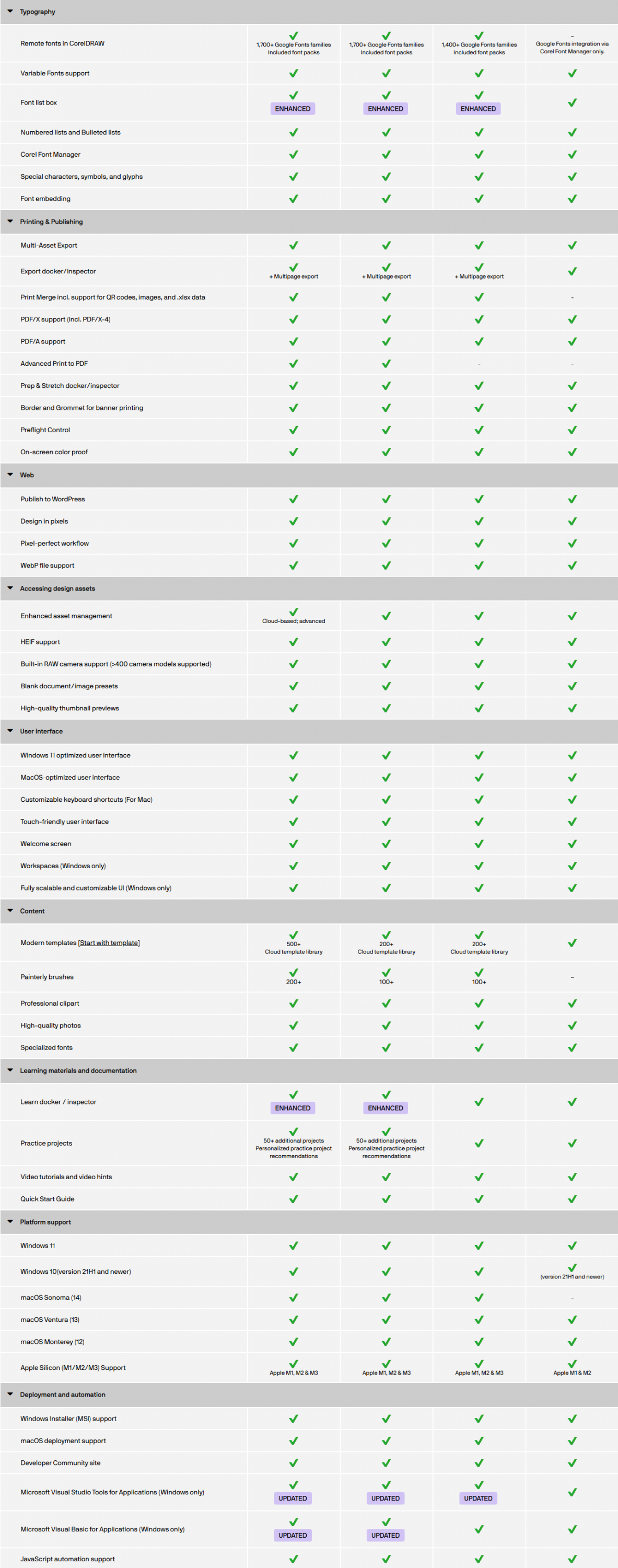 ตารางเปรียบเทียบ ชุดโปรแกรมกราฟิก รุ่นสูงสุด CorelDRAW Graphics Suite ในแต่ละเวอร์ชัน