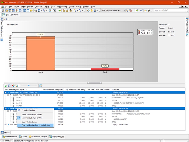 โปรแกรมจัดการฐานข้อมูล Toad for Oracle มาพร้อมเครื่องมือ PL/SQL Profiler ที่สามารถตรวจสอบได้ว่าทำไมโค้ด PL/SQL ที่เราเขียนขึ้นมาถึงได้ทำงานช้า โดยมีการแสดงให้เห็นภาพอย่างชัดเจนว่าเกิดปัญหาขอขวดขึ้นที่จุดไหน ช่วยให้เราสามารถเข้าใจ และแก้ไขปัญหาที่เกิดขึ้นในการเขียนโค้ดได้อย่างตรงจุด