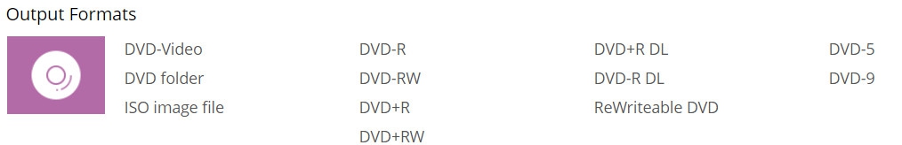 ด้วยความสามารถของ โปรแกรมไรท์แผ่นดีวีดี Xilisoft DVD Creator คุณสามารถสร้างแผ่น DVD ภาพยนตร์ จากคลิปวิดีโอที่ถ่ายด้วยกล้องวิดีโอ (Camcorder) หรือ สมาร์ทโฟน (Smartphone) ได้ง่ายๆ โดยตัวโปรแกรม รองรับรูปแบบ แผ่น DVD ยอดนิยมหลายประเภท ดังนี้