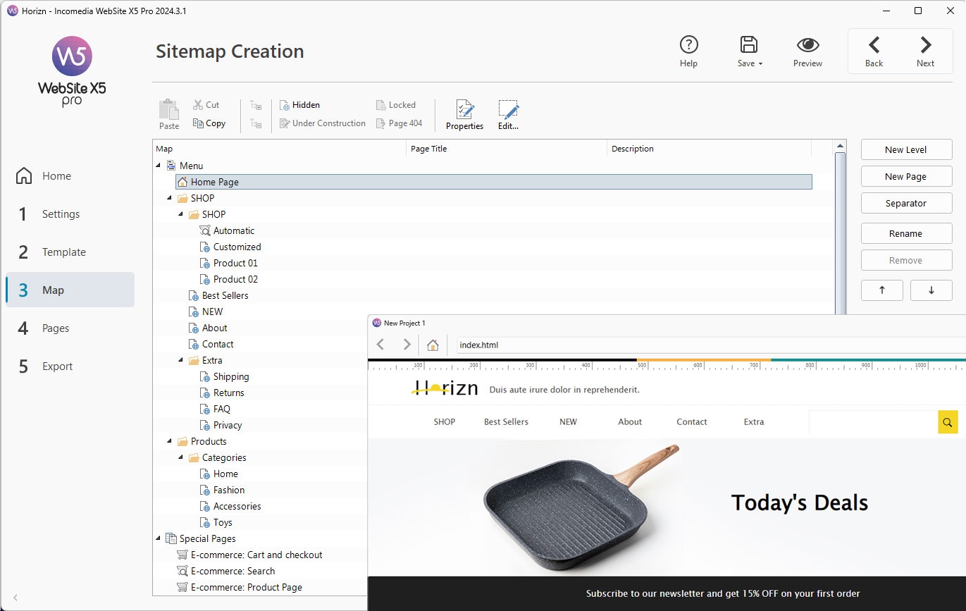 - เลือกเปลี่ยนหน้า Home Page ได้อย่างง่ายดาย โดยทำผ่าน Map ของเว็บไซต์ เลือกหน้า Home Page หน้าใหม่ด้วยการคลิกเพียงครั้งเดียว และหน้าเว็บนั้นจะกลายเป็นหน้าเพจของโปรเจกต์ใหม่ และลิงก์จะถูกอัปเดตทั้งหมด