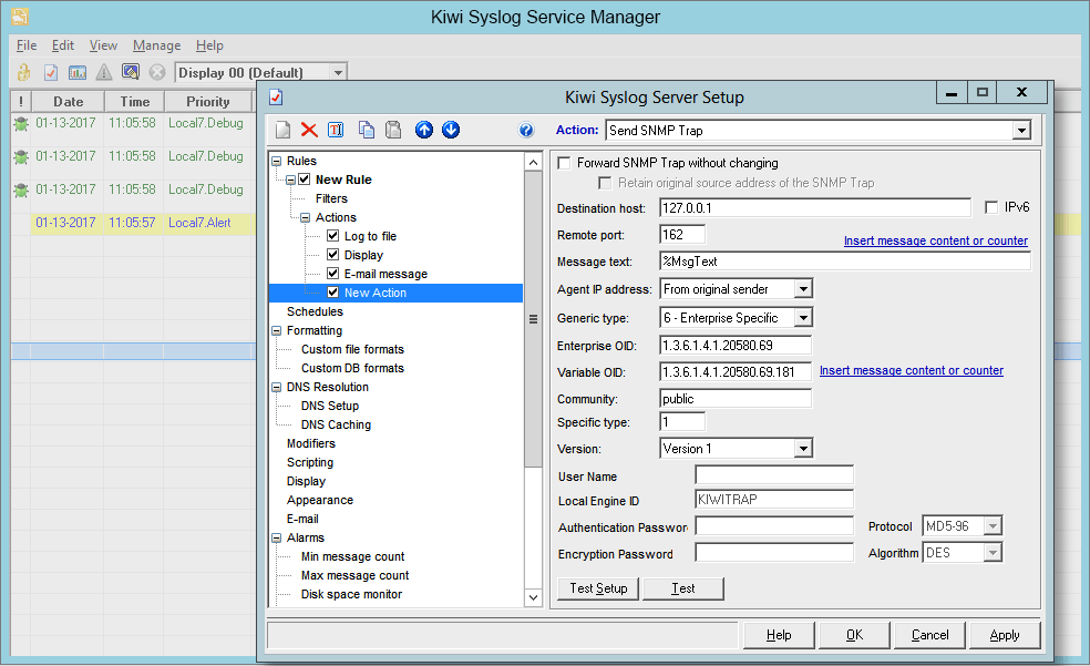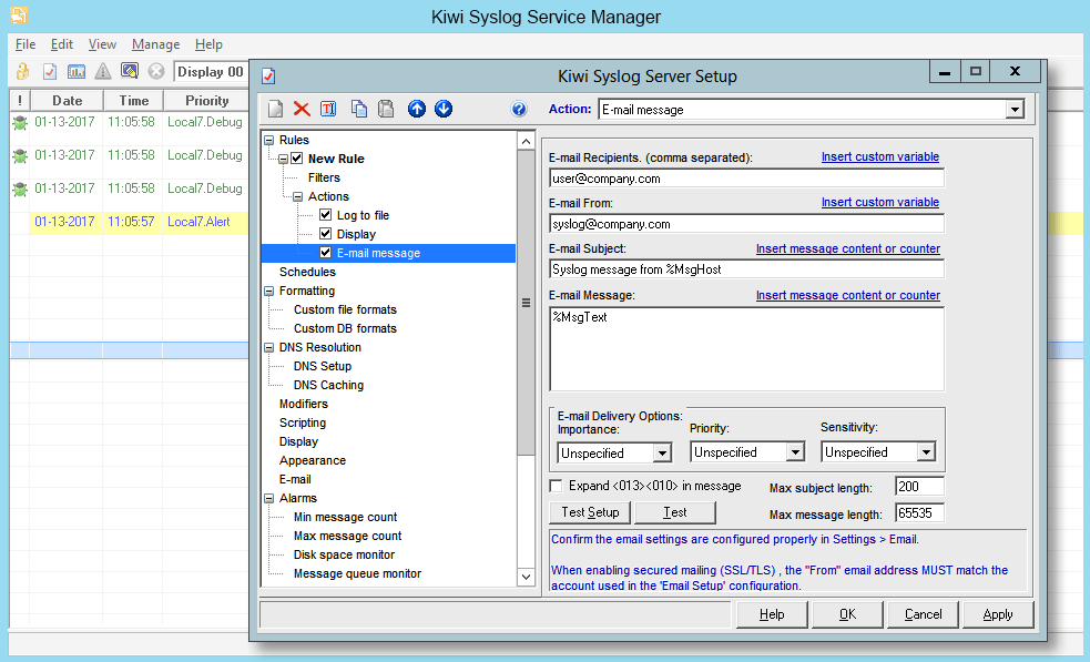 โปรแกรมจัดการข้อความล็อกของระบบ Kiwi Syslog Server มีความสามารถในการตอบสนองต่อเหตุการณ์อันไม่พึงประสงค์ในระบบคอมพิวเตอร์ได้โดยอัตโนมัติ เพื่อไม่ให้เกิดความเสียหายลุกลามใหญ่โต ไม่ว่าจะเป็นการส่งอีเมลหาผู้ดูแลระบบ หรือผู้มีส่วนเกี่ยวข้องโดยอัตโนมัติเมื่อมี Syslog บางประเภทเกิดขึ้น รวมถึงสามารถกำหนดให้มีการรันสคริปต์เพื่อแก้ไขปัญหา รวมถึงกำหนดให้มีการจัดเก็บ Log ในรูปแบบไฟล์ หรือจัดเก็บไว้ในฐานข้อมูล และยังสามารถกำหนดให้เกิดกิจกรรมรูปแบบอื่นๆ ได้อีกมากมาย เมื่อมี Syslog บางอย่างเกิดขึ้น