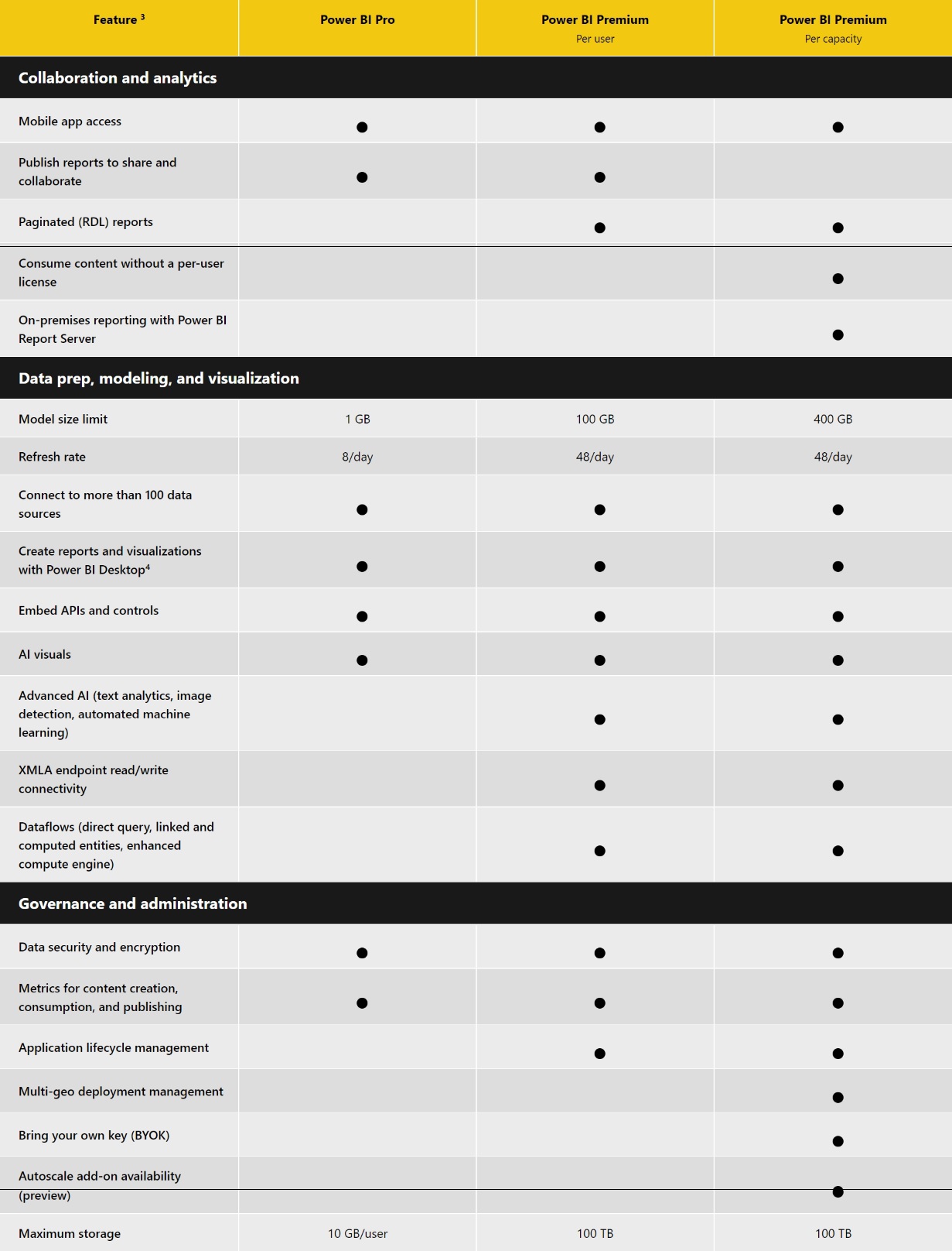 ตารางเปรียบเทียบ โปรแกรมวิเคราะห์ข้อมูลธุรกิจอัจฉริยะ Power BI ในแต่ละเวอร์ชัน
