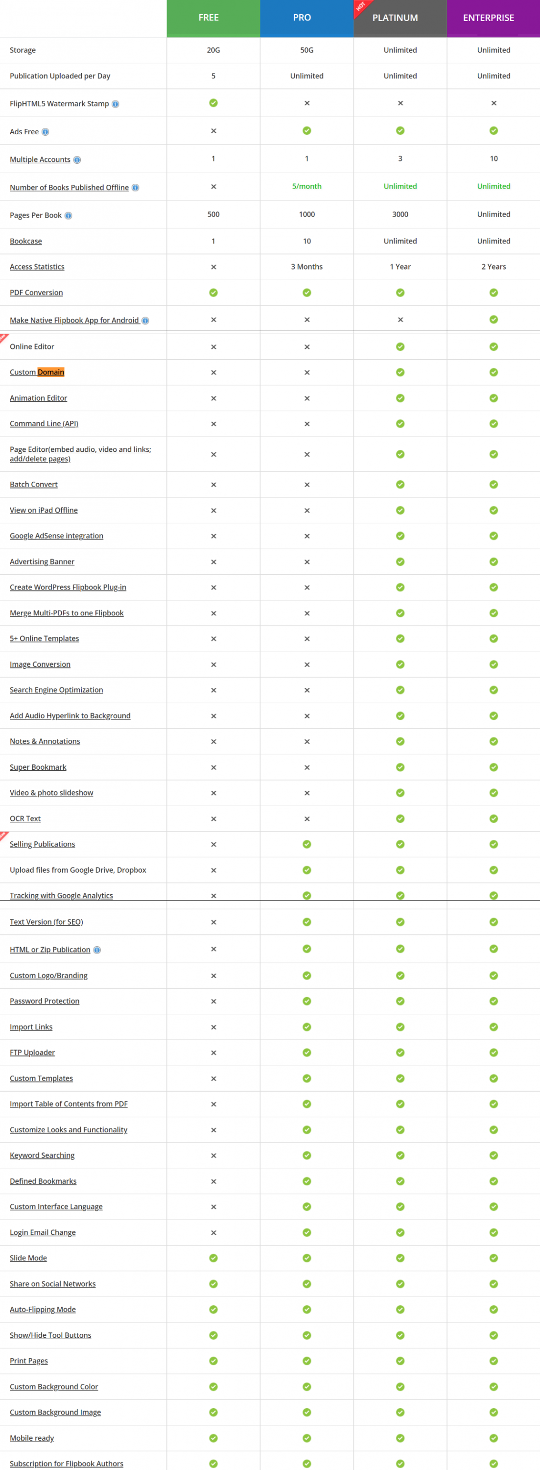 ตารางเปรียบเทียบ โปรแกรมทำอีบุ๊กออนไลน์ FLIPHTML5 ในแต่ละเวอร์ชัน