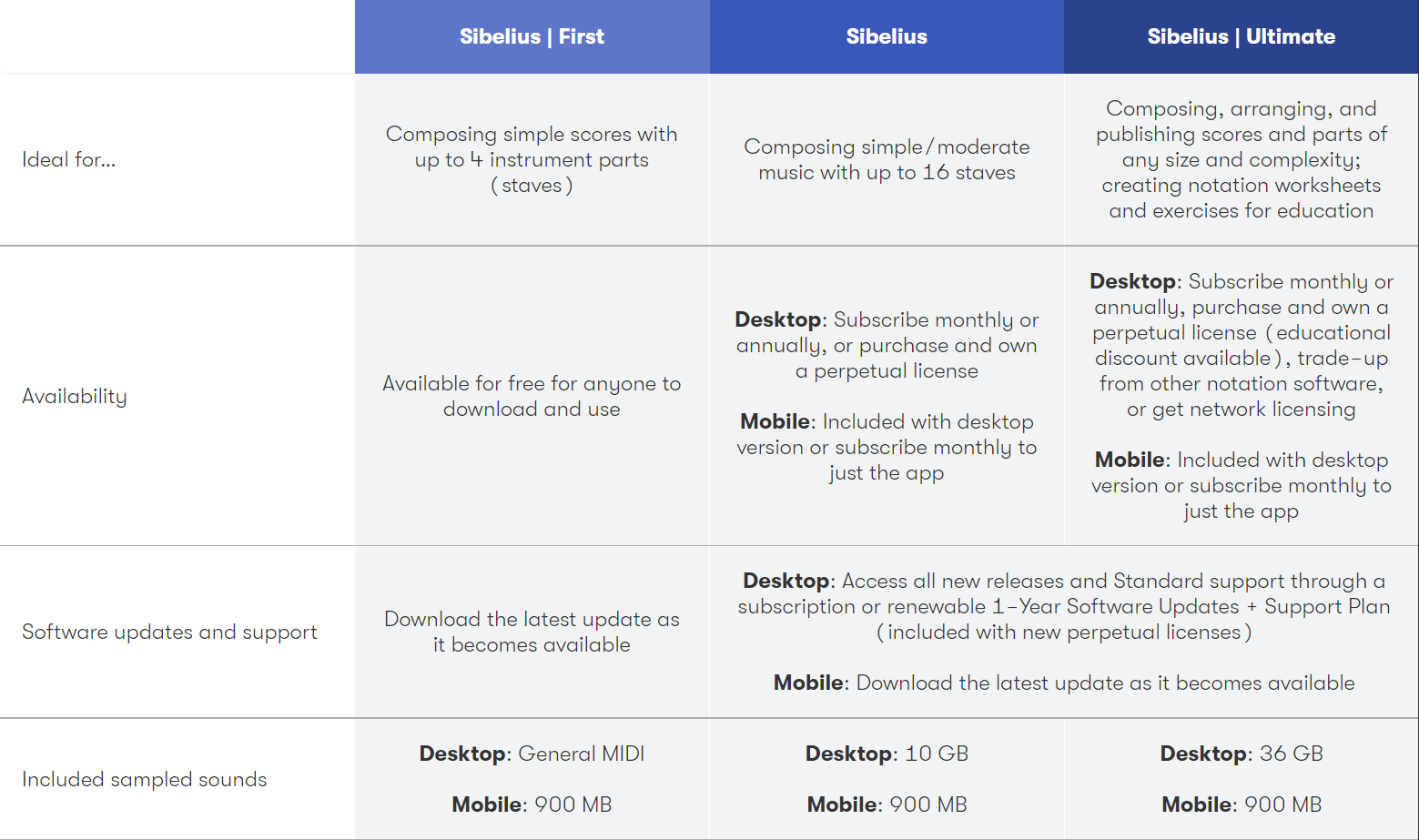 ตารางเปรียบเทียบความสามารถ โปรแกรมแต่งเพลง Avid Sibelius ในแต่ละเวอร์ชัน