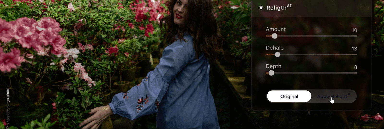 โปรแกรมแต่งรูป ด้วยพลังการประมวลผลปัญญาประดิษฐ์ Luminar Neo มาพร้อมเครื่องมือ Relight AI ช่วยเปลี่ยนภาพที่ตัวแบบมืดเพราะถ่ายย้อนแสง ให้เป็นภาพที่มีรายละเอียดโดดเด่นสวยงาม ด้วยการทำงานของระบบปัญญาประดิษฐ์ที่จะคำนวณมิติความลึกของภาพ จากนั้นจะทำแผนที่ 3 มิติของภาพ ทำให้สามารถเกลี่ยแสงลงในส่วนที่มืดของภาพได้อย่างเป็นธรรมชาติตลอดทั่วทั้งภาพ และเรายังสามารถเพิ่มแสงในส่วนของฉากหลัง และฉากหน้าแยกจากกันได้ด้วย ทำให้สามารถปรับบางส่วนของภาพให้มืดเพื่อเน้นจุดอื่น ๆ ของภาพได้ตามต้องการ