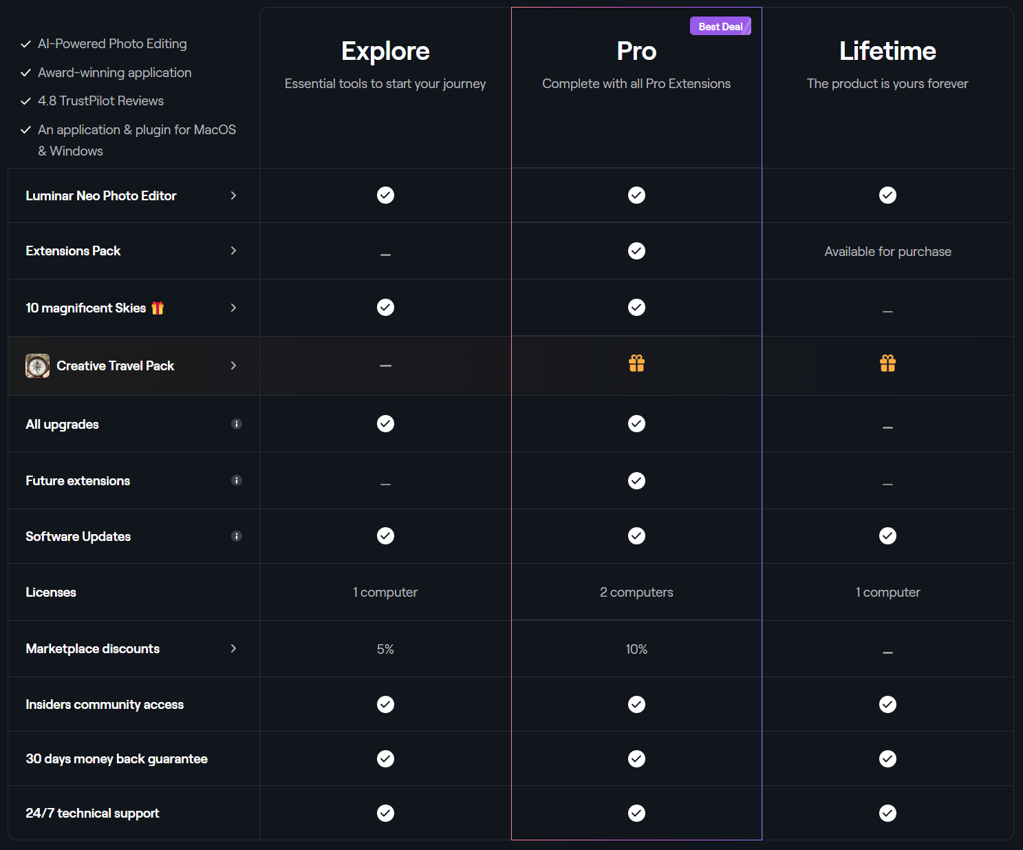 โปรแกรมแต่งรูป ด้วยพลังการประมวลผลปัญญาประดิษฐ์ รุ่นซื้อขาด เสียเงินครั้งเดียวใช้งานได้ตลอดไป โดยโปรแกรมรองรับการใช้งานทั้งบน ระบบปฏิบัติการ Windows, macOS รวมถึงรองรับการใช้งานในรูปแบบปลั๊กอินสำหรับ โปรแกรม Adobe Photoshop และ โปรแกรม Adobe Lightroom และมาพร้อมกับแพ็กเสริม Creative Travel Pack สำหรับแต่งรูปถ่ายวิวทิวทัศน์ท่องเที่ยว ที่รวมฉากหลังท้องฟ้าสวย ๆ 20 แบบ พรีเซ็ตการแต่งรูปสวย ๆ 30 แบบ และค่า LUTs สำหรับการปรับโทนสีภาพ 6 แบบ ช่วยให้รูปถ่ายจากทริปท่องเที่ยวโดดเด่นเหนือใคร