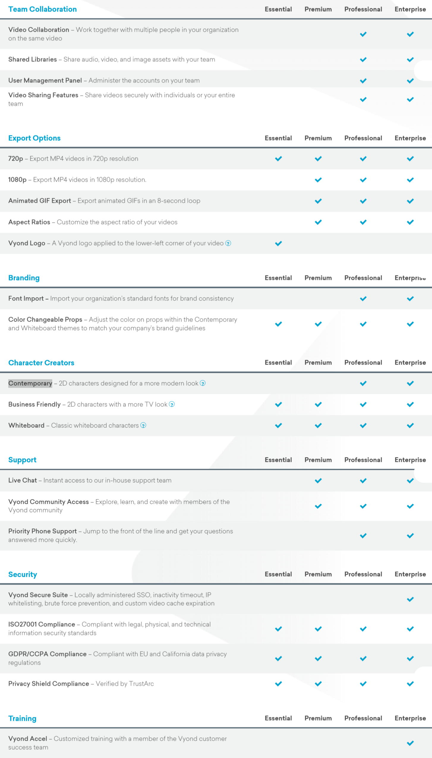 ตารางเปรียบเทียบ โปรแกรมตัดต่อวิดีโอสำหรับธุรกิจ Vyond ในแต่ละเวอร์ชัน