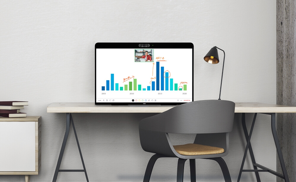 จอทัชสกรีน 27 นิ้วพร้อม เว็บแคม ไมโครโฟน และลำโพงในตัวสำหรับประชุมออนไลน์ผ่านบริการ ZOOM for Home หน้าจอยังใช้เป็นกระดานดิจิทัลไวท์บอร์ด เขียนจดบันทึกไอเดียลงบนหน้าจอได้ด้วย