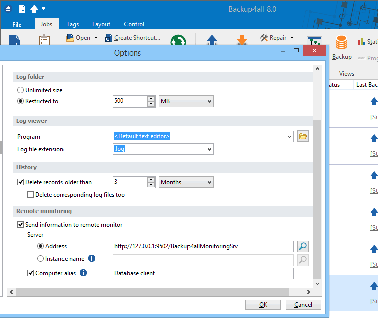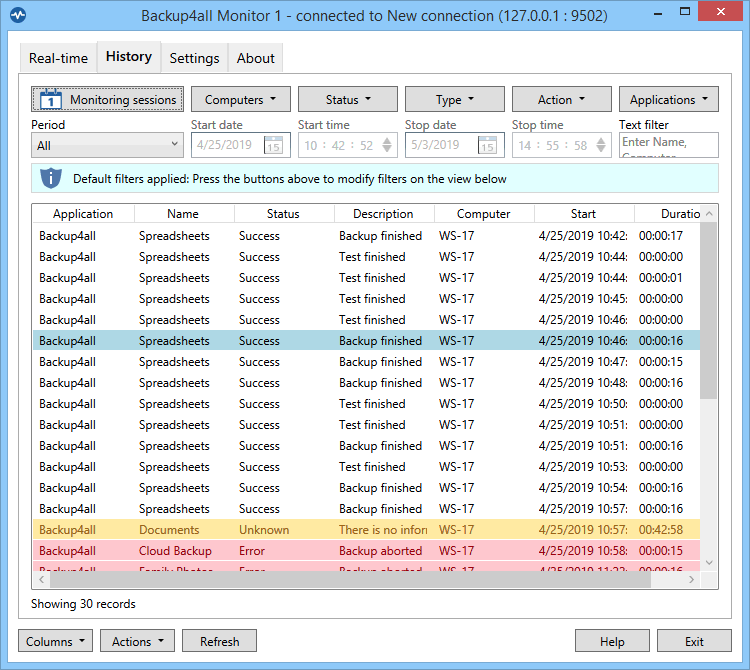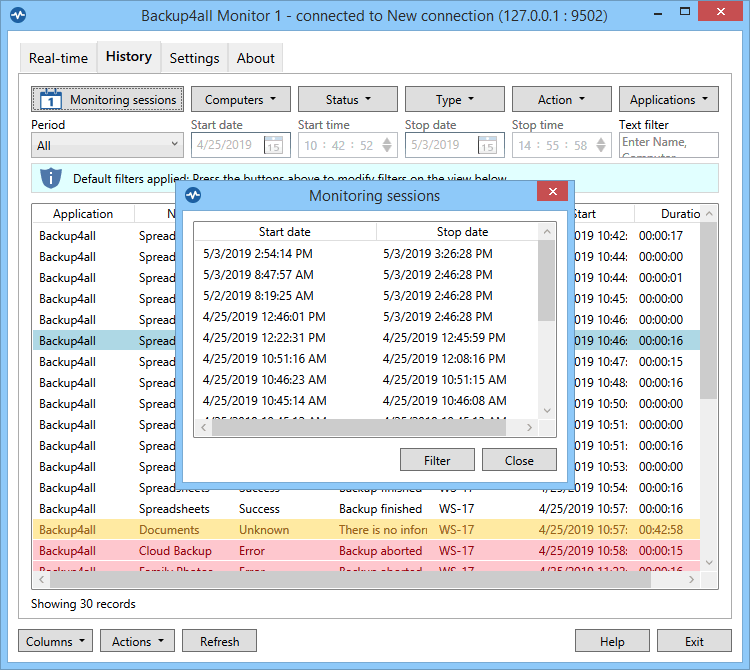 นอกจากความสามารถในการตรวจสอบการสำรองข้อมูลที่เกิดขึ้นแบบเรียลไทม์แล้ว โปรแกรมจัดตั้งเซิร์ฟเวอร์ มอนิเตอร์การสำรองข้อมูล Backup4all Monitor ยังสามารถเก็บประวัติการสำรองข้อมูลของ PC/เซิร์ฟเวอร์ ทุกเครื่อง ทำให้ผู้ดูแลระบบสามารถตรวจสอบประวัติการทำงานย้อนหลัง โดยมีการเก็บรายละเอียดแบบลงลึกสำหรับแต่ละ Session การทำงาน