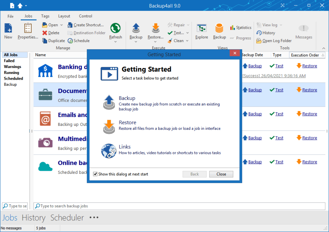Backup4all Portable 9 โปรแกรมนี้เป็น โปรแกรมยูทิลิตี้ ที่มีความสามารถด้าน การสำรองข้อมูล (Backup Data) จากค่ายผู้พัฒนาที่มีชื่อว่า บริษัท Softland โปรแกรมด้านการเก็บสำรองไฟล์งาน ไฟล์เอกสาร ไฟล์ข้อมูลสำคัญ บนระบบปฏิบัติการ Windows ที่มีรางวัลเป็นการันตี ได้รับการออกแบบมาเพื่อป้องกันไฟล์ข้อมูลสำคัญของเราจากการ สูญเสีย/สูญหาย เพียงบางส่วน หรือทั้งหมด