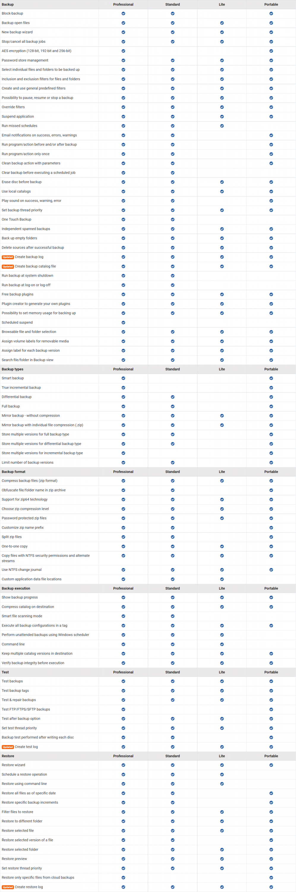 โปรแกรมสำรองข้อมูล Backup ไฟล์ รุ่นมาตรฐาน มาพร้อมกับฟีเจอร์ทุกอย่างที่มีอยู่ในรุ่น Lite โดยฟีเจอร์ที่มีเพิ่มเข้ามาในรุ่น Standard ก็มี อาทิ ความสามารถในการเก็บสำรองไฟล์แบบ Full Backup (Backup ข้อมูลเอาไว้ทั้งหมด) ความสามารถในการสำรองข้อมูลแบบ Differential Backup (ในการ Backup แต่ละครั้ง จะมีการเก็บสำรองข้อมูลในส่วนที่แตกต่างจากการทำ Full Backup ในครั้งแรกเอาไว้ทั้งหมด) และสามารถเลือกที่จะเรียกคืนไฟล์ที่มีเก็บสำรองไว้หลายเวอร์ชันได้ตามต้องการ