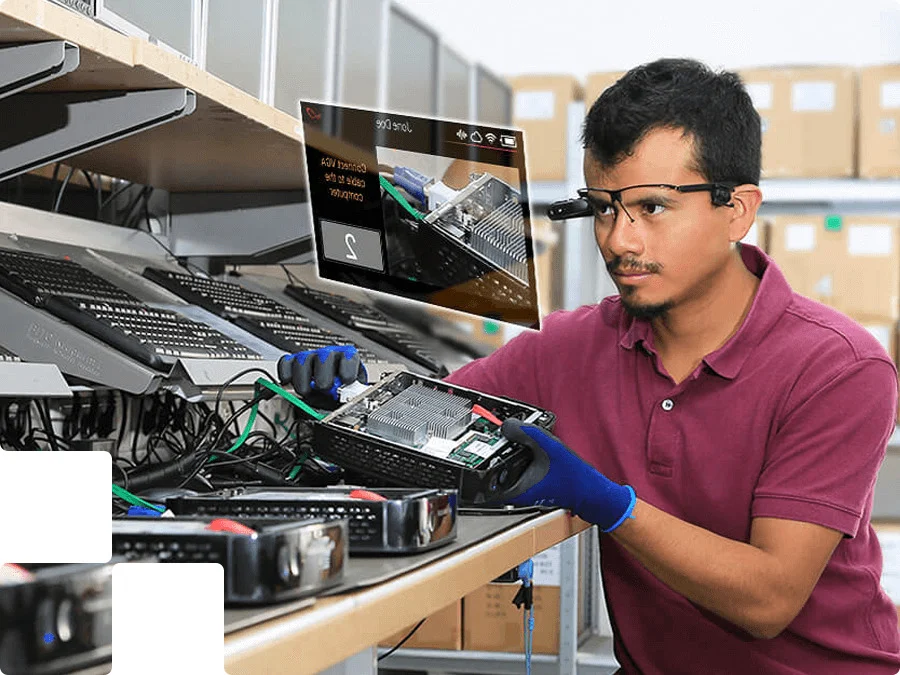 โซลูชันที่ถูกออกแบบมาโดยเฉพาะสำหรับอุตสาหกรรมด้านการผลิต จะได้รับประโยชน์จาก การแสดงคู่มือการประกอบชิ้นส่วนอุปกรณ์อิเล็กทรอนิกส์ หรือชิ้นส่วนของเครื่องยนต์ที่มีความซับซ้อน ช่วยเพิ่มความสะดวก คล่องตัว เพิ่มความแม่นยำ และลดความผิดพลาดของเจ้าหน้าที่ในไลน์การผลิตได้เป็นอย่างดี เปลี่ยนจากการเปิดดูขั้นตอนการทำงานผ่านหน้าจอ หรือเอกสารกระดาษ มาเป็นการเรียกดูคู่มือการประกอบชิ้นส่วนสินค้าผ่านแว่นตา Smart Glass ทำให้ไม่ต้องละสายตาออกจากงานที่กำลังทำอยู่ และเหลือมือทั้ง 2 ข้างสำหรับการทำงาน โดยแนะนำการประกอบสินค้าอย่างละเอียด ทีละขั้นตอน
