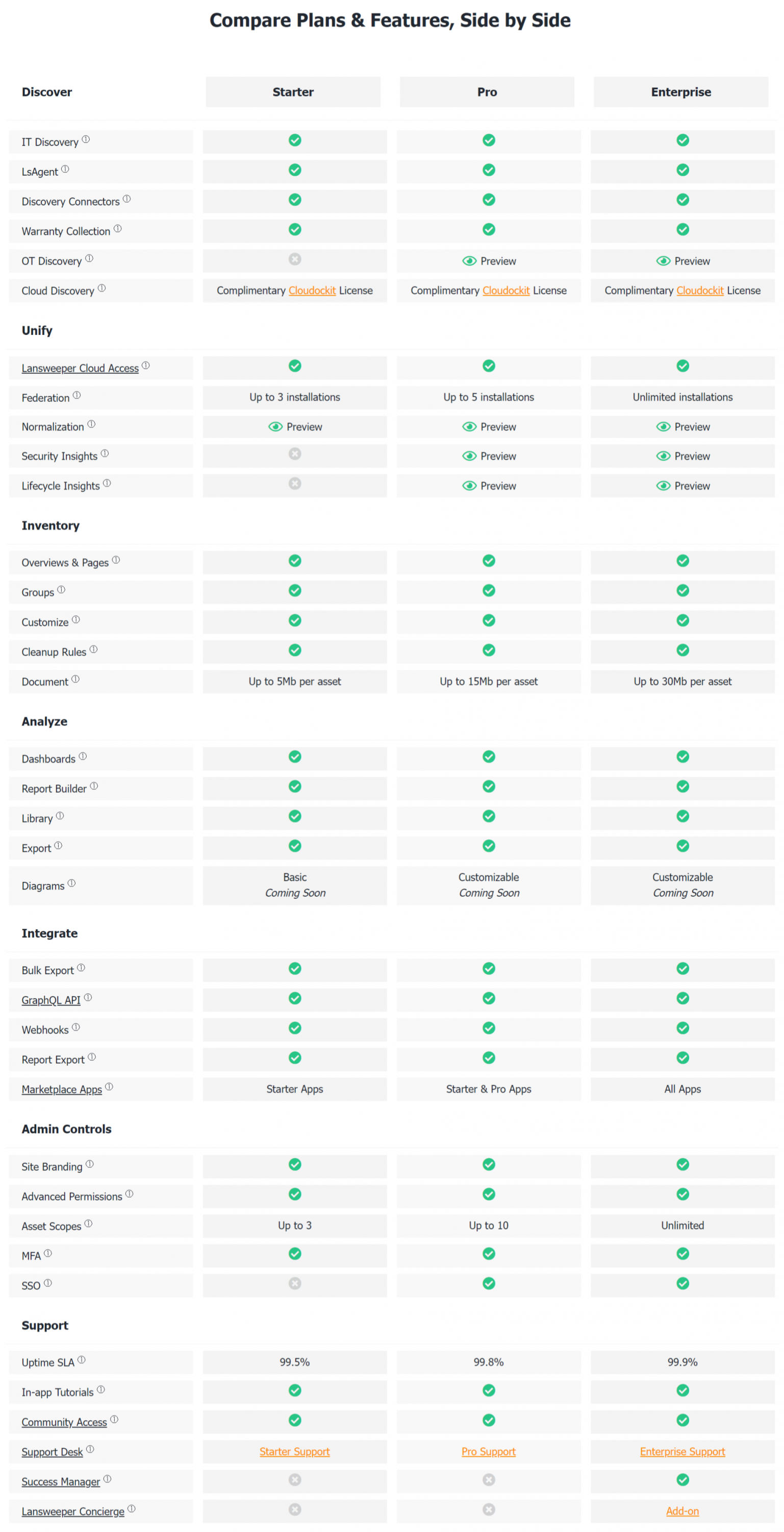 ตารางเปรียบเทียบ โปรแกรมเก็บข้อมูลอุปกรณ์ IT อุปกรณ์เน็ตเวิร์ค Lansweeper ในแต่ละเวอร์ชัน