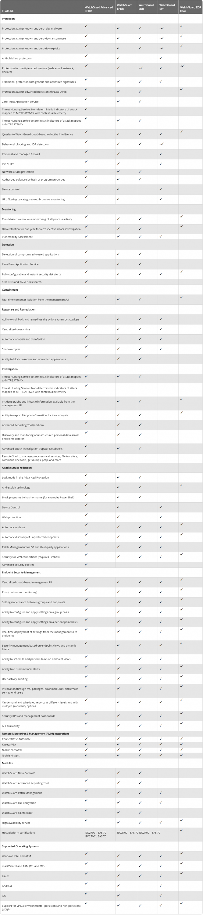 ตารางเปรียบเทียบความสามารถ โปรแกรมแอนตี้ไวรัส สำหรับธุรกิจ WatchGuard ในแต่ละเวอร์ชัน