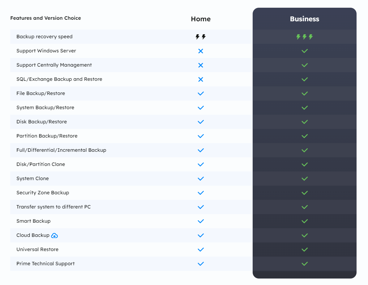 ตารางเปรียบเทียบ โปรแกรมสำรองข้อมูล EaseUS Todo Backup รุ่นสำหรับการใช้งานในบ้าน (Home) และรุ่นสำหรับการใช้งานในธุรกิจ (Business)
