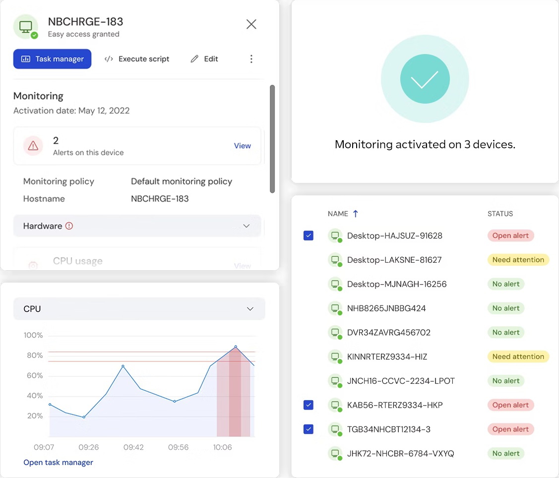 โปรแกรมดูแลระบบคอมพิวเตอร์เรียลไทม์ แก้ปัญหาอัตโนมัติ TeamViewer DEX สามารถมอนิเตอร์อุปกรณ์ของพนักงานได้แบบเรียลไทม์ ทั้งด้านฮาร์ดแวร์ (CPU, RAM, พื้นที่เก็บข้อมูล, ระดับแบตเตอรี่) และซอฟต์แวร์ (Process, Service, ประสิทธิภาพของระบบเครือข่าย) ทำให้ทีม IT มองเห็นสถานะปัจจุบันของทุกอุปกรณ์คอมพิวเตอร์ได้ทันที สามารถจัดการเพื่อป้องกันก่อนที่ปัญหาจะเกิด