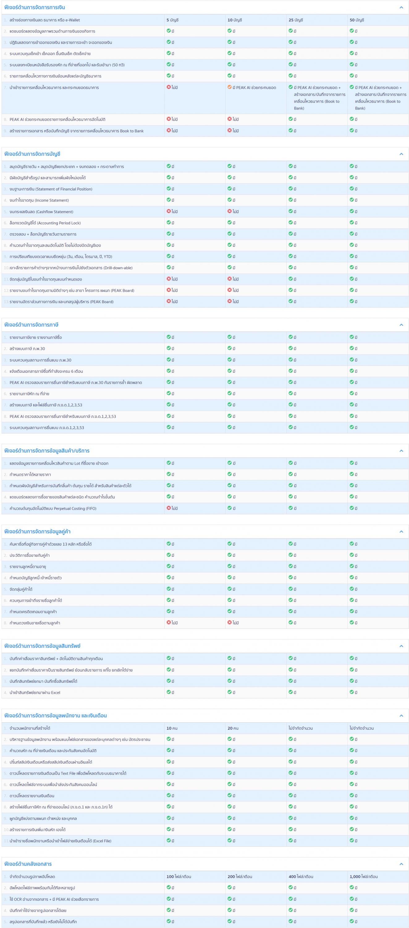 ตารางเปรียบเทียบ โปรแกรมบัญชีออนไลน์ PEAK ในแต่ละเวอร์ชัน