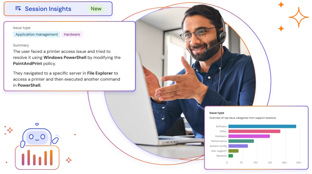 นอกจากนี้ฟีเจอร์ Session Insights ที่มีอยู่ใน ส่วนเสริม AI สรุปเคส Support ช่วยวินิจฉัยปัญหา TeamViewer Intelligence ยังช่วยลดภาระของเจ้าหน้าที่ที่ต้องบันทึกข้อมูลเองในทุกเคส ซึ่งมักใช้เวลามากและเสี่ยงต่อความผิดพลาด การมี AI ช่วยจัดทำบันทึกที่แม่นยำและสม่ำเสมอ ช่วยให้หัวหน้าที่ม IT Support สามารถวิเคราะห์แนวโน้มของปัญหาได้จากมุมมองภาพรวม เช่น ปัญหาซ้ำซ้อนที่เกิดบ่อย หรือลักษณะปัญหาที่ใช้เวลานานในการแก้ไข ซึ่งเป็นข้อมูลสำคัญในการวางแผนปรับปรุงกระบวนการให้บริการในอนาคต