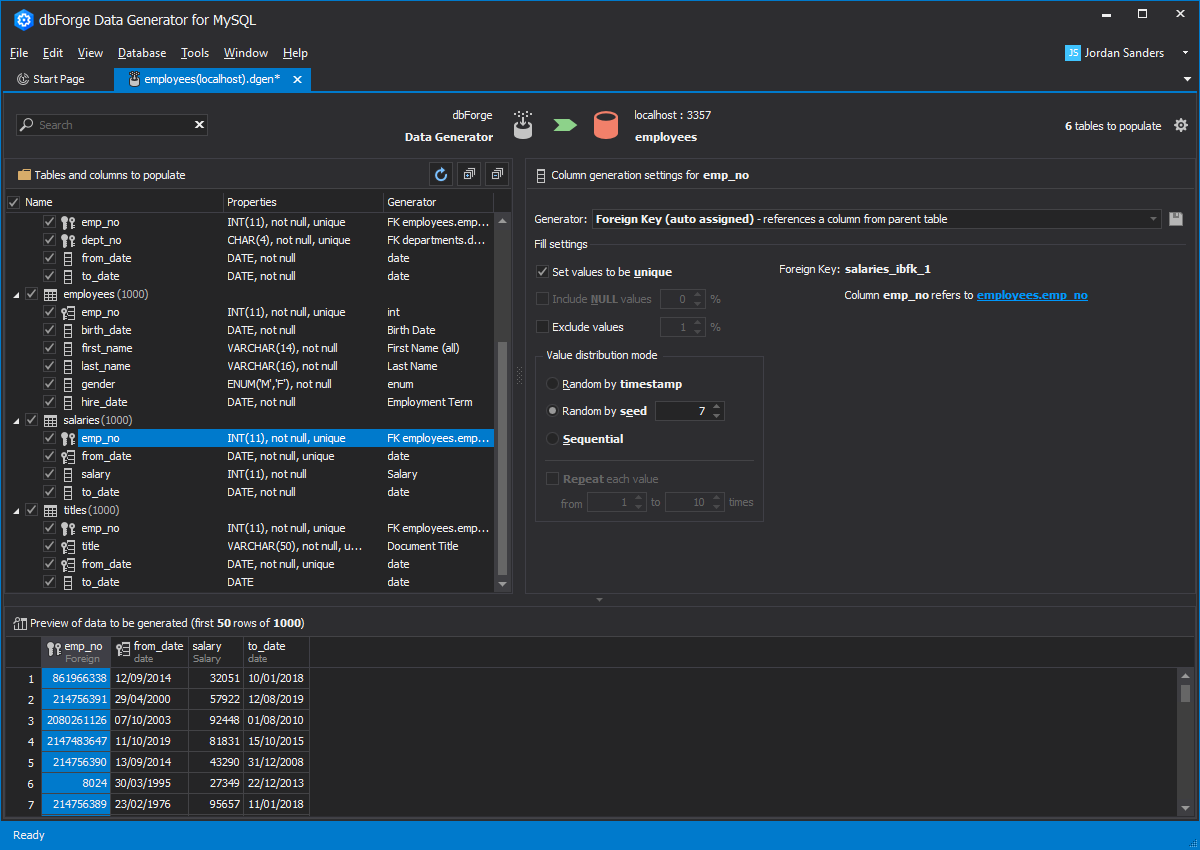 อีกหนึ่งประโยชน์สำคัญของ โปรแกรมสร้างข้อมูลทดสอบ Devart dbForge Data Generator for MySQL Standard คือความสามารถในการรักษาความสัมพันธ์ของข้อมูลระหว่างหลายตาราง รองรับตารางที่มี Foreign Keys, Constraints หรือความสัมพันธ์แบบซับซ้อน ทำให้การสร้างข้อมูลจำนวนมากในฐานข้อมูลขนาดใหญ่เป็นเรื่องง่ายขึ้นโดยไม่ทำให้โครงสร้างฐานข้อมูลเสียหาย นอกจากนี้ยังมีตัวเลือกในการปิดการทำงานของ Triggers หรือ Constraints ชั่วคราวขณะสร้างข้อมูล เพื่อลดปัญหาความขัดแย้งหรือ Error ที่อาจเกิดขึ้นในฐานข้อมูลที่มีการป้องกันข้อมูลหลายชั้น ทำให้เติมข้อมูลลงฐานข้อมูลได้อย่างราบรื่น ไม่มีปัญหาเรื่องความสอดคล้อง