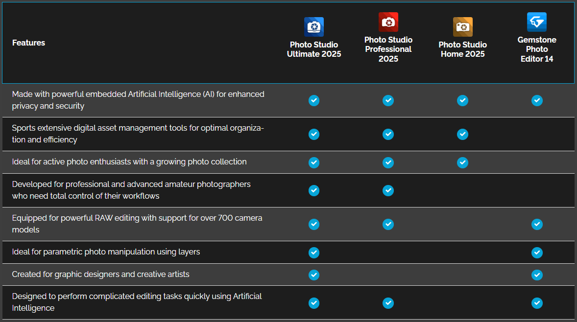 ตารางเปรียบเทียบ โปรแกรมดู แก้ไข และจัดการรูปภาพ ACDSee Photo Studio ในแต่ละเวอร์ชัน